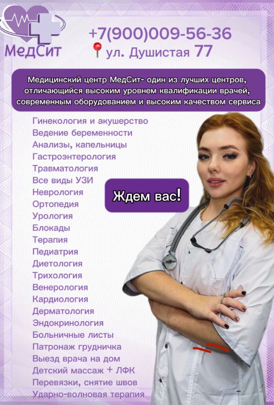 Клиника МедСит - это многопрофильное медицинское учреждение, предлагающее индивидуальный комплекс процедур и услуг для каждого клиента. Работа клиники организована с учетом комфортного пребывания посетителей. Оснащение центра помогает провести диагностические исследования организма пациента для составления программы лечения и профилактических мероприятий. В клинике работают отделения общей терапии, кардиологии, гастроэнтерологии, неврологии, эндокринологии, дерматологии, венерологии, урологии, андрологии, гинекологии, акушерства, педиатрии. Наши специалисты имеют соответствующие знания и с пониманием отнесутся к вашим проблемам. Доверяя свое лечение нам, вы можете быть уверены в результате. Также мы поможем с составлением диеты и коррекцией веса.